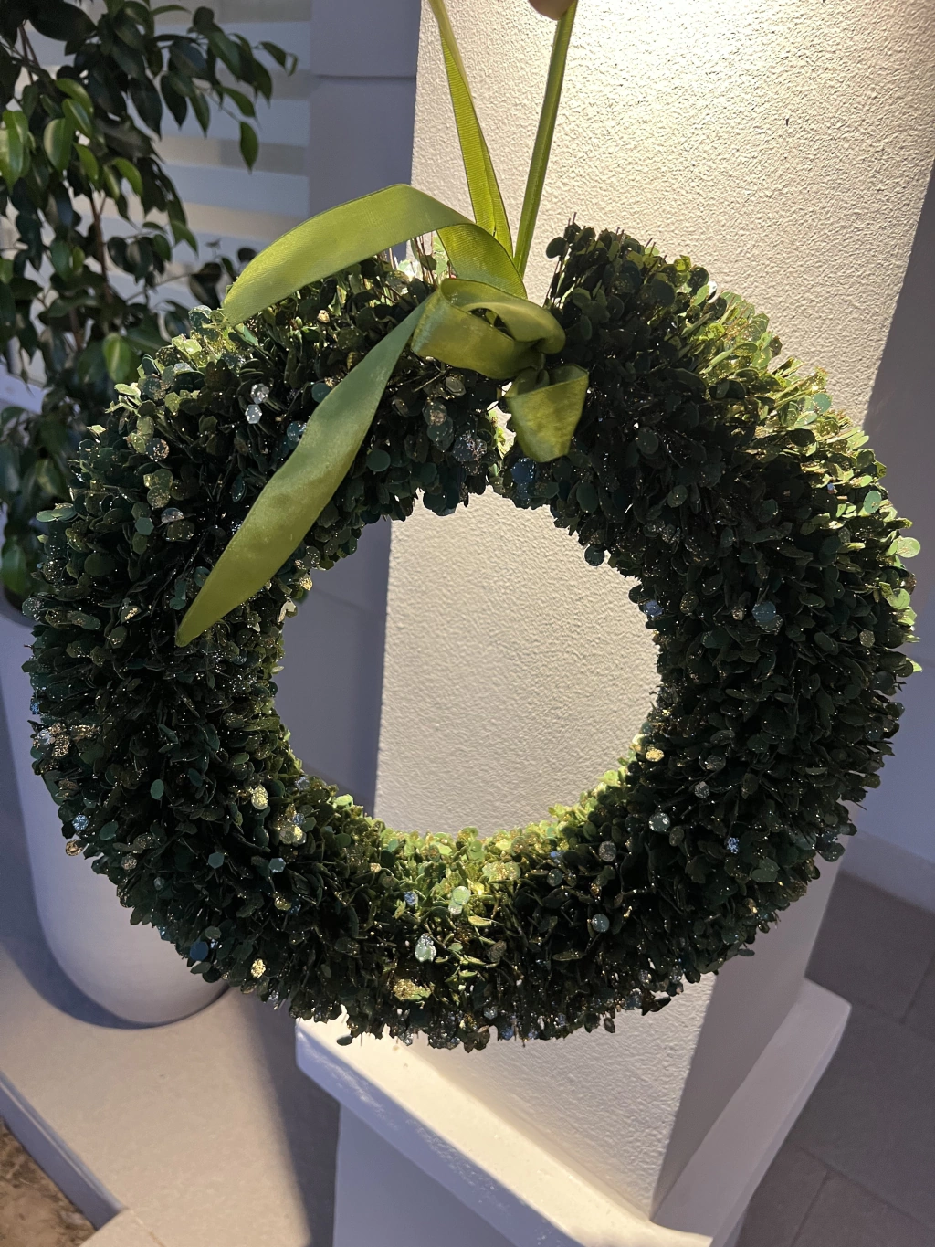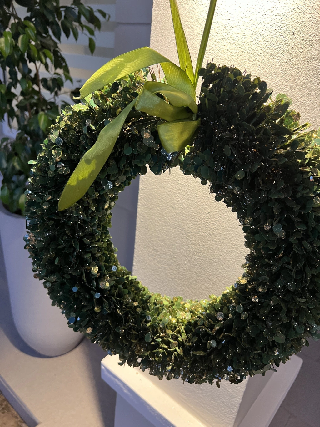 Hermosa corona navideña con hojas verdes y destellos en dorado. Ideal para colgar o decorar una mesa con velas. Disponible en dos medidas: 30cm de diámetro y 40cm de diámetro.